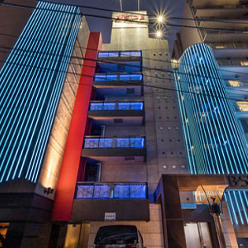 シックな外観に、煌びやかなレインボー照明が夜の五反田を照らします…
