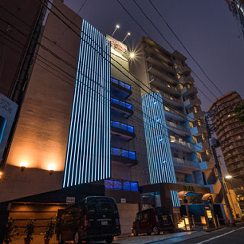 シックな外観に、煌びやかなレインボー照明が夜の五反田を照らします…